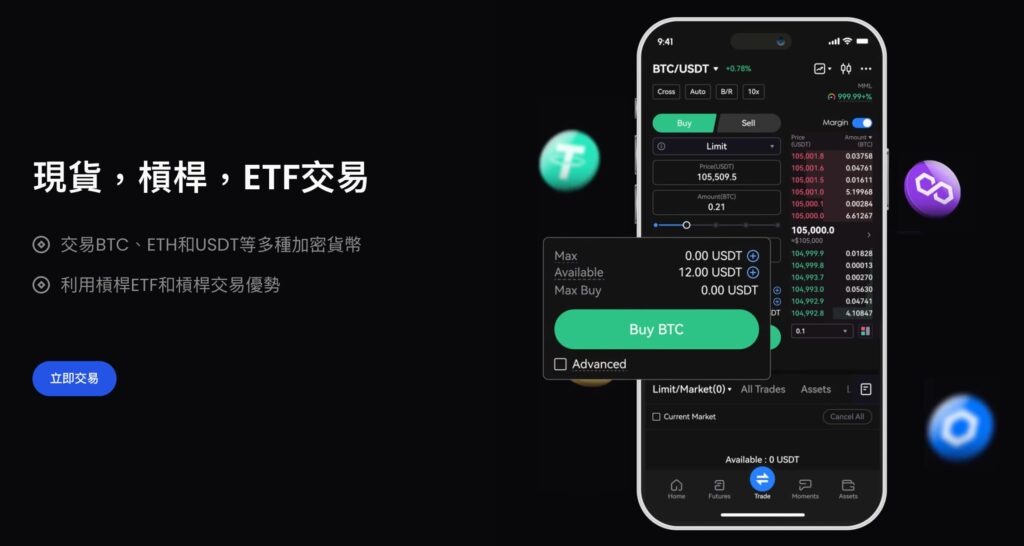 | 交易類型 | 現貨、保證金、期貨、ETF、跟單交易、交易機器人 |